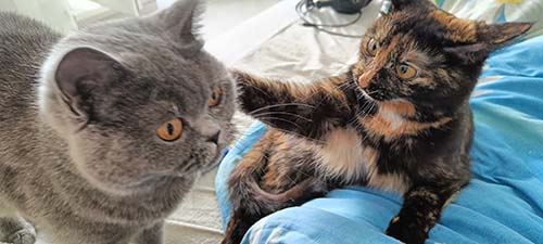 Промпт: Британская кошка говорит второй: Малявка, Анекдот! Почему у некоторых кошек короткие лапы и хвост? Вторая кошка отвечает: Почему? Британская кошка говорит: Потому что они не доросли. В конце обе кошки сильно смеются.