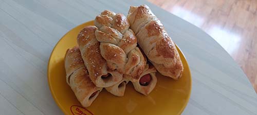 Промпт: сосиски в тесте по-очереди поднимаются со звуками "Ох", "Эх", "Как же я зачерствела, подруга" и разбредаются в разные стороны из тарелки, кряхтя и шоркая.